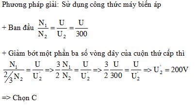 Đặt vào hai đầu cuộn dây sơ cấp của máy biến áp lí tưởng một điện áp xoay chiều có giá trị hiệu dụng không đổi thì điện áp hiệu dụng hai đầu cuộn dây thứ cấp để hở là 300V. Nếu giảm bớt một phần ba tổng số vòng dây của cuộn thứ cấp thì điện áp hiệu dụng hai đầu của nó là
