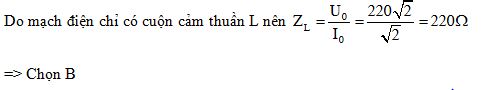 Đặt vào hai đầu cuộn dây thuần cảm L một điện áp u=220\(\sqrt2\)cos(ωt+φ) (V) thì dòng điện chạy qua cuộn dây là i=\(\sqrt2\)cos(ωt)(A). Giá trị của ZL là: