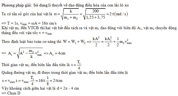 Một vật có khối lượng m1=1,25kg mắc vào một lò xo nhẹ có độ cứng k=200N/m, đầu kia của lò xo gắn chặt vào tường. Vật và lò xo đặt trên mặt phẳng nằm ngang ma sát không đáng kể. Đặt vật thứ hai có khối lượng m2=3,75 kg sát với vật thứ nhất rồi đẩy chậm cả hai vật cho lò xo nén lại 8 cm. Khi thả nhẹ chúng ra, lò xo đẩy hai vật chuyển động về một phía. Lấy π2=10. Khi lò xo giãn cực đại lần đầu tiên thì hai vật cách xa nhau một đoạn là