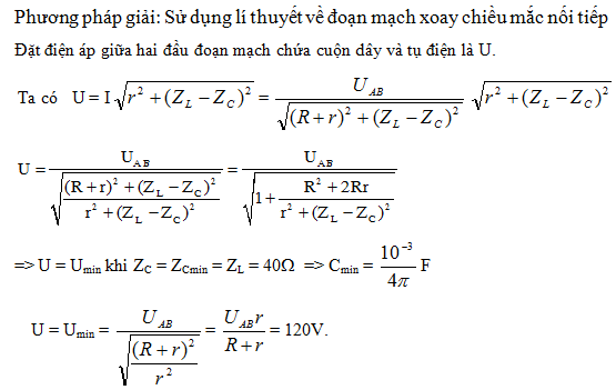 cos100πt (V), t tính bằng giây. Người ta thấy rằng khi C=Cm thì điện áp hiệu dụng ở hai đầu đoạn mạch chứa cuộn dây và tụ điện đạt cực tiểu Umin. Giá trị của Cm và Umin lần lượt là