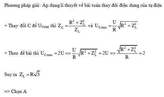 cosωt(V) và làm thay đổi điện dung của tụ điện thì thấy điện áp hiệu dụng giữa hai bản tụ đạt cực đại bằng 2U. Quan hệ giữa cảm kháng ZL và điện trở thuần R là