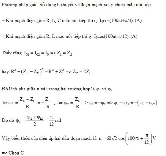 Đặt điện áp xoay chiều có giá trị hiệu dụng 60V vào hai đầu đoạn mạch R, L, C mắc nối tiếp thì cường độ dòng điện qua đoạn mạch là i1=I0cos(100πt+π/4) (A). Nếu ngắt bỏ tụ điện C thì cường độ dòng điện qua đoạn mạch là i2=I0cos(100πt-π/12) (A). Điện áp hai đầu đoạn mạch là