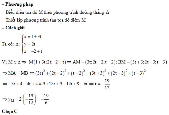 Trong không gian với hệ tọa độ Oxyz, cho hai điểm \(A\left( {1;2;0} \right),B\left( { - 2;3;1} \right))\) , đường thẳng \(\Delta :{{x - 1} \over 3} = {y \over 2} = {{z + 2} \over 1}\). Tung độ điểm M trên \(\Delta \) sao cho MA=MB là