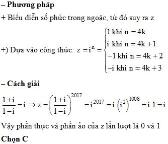 Phần thực và phần ảo của số phức \(z = {\left( {{{1 + i} \over {1 - i}}} \right)^{2017}}\) lần lượt là: