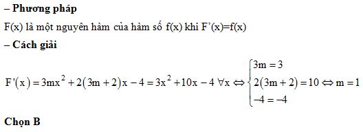 Giá trị của m để hàm số \(F\left( x \right) = m{x^3} + \left( {3m + 2} \right){x^2} - 4x + 3\) là một