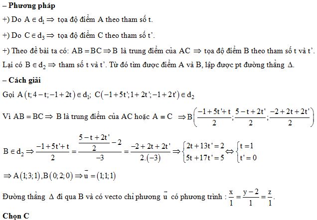 \({d_1}:\left\{ \matrix{ x = t \hfill \cr y = 4 - t \hfill \cr z = - 1 + 2t \hfill \cr} \right.;\,\,\,\,{d_2}:\left\{ {{x \over 1} = {{y - 2} \over { - 3}} = {z \over { - 3}}} \right.\) \({d_3}:{{x + 1} \over 5} = {{y - 1} \over 2} = {{z + 1} \over 2}\) . Viết phương trình đường thẳng , \(\Delta \), biết \(\Delta \) cắt d1, d2, d3 lần lượt tại A, B, C sao cho AB = BC