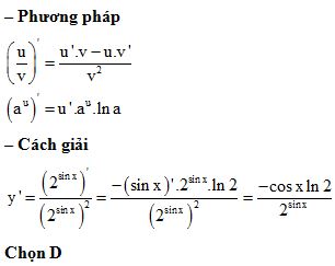 Đạo hàm của hàm số \(y = {1 \over {{2^{{\mathop{\rm sinx}\nolimits} }}}}\) là: