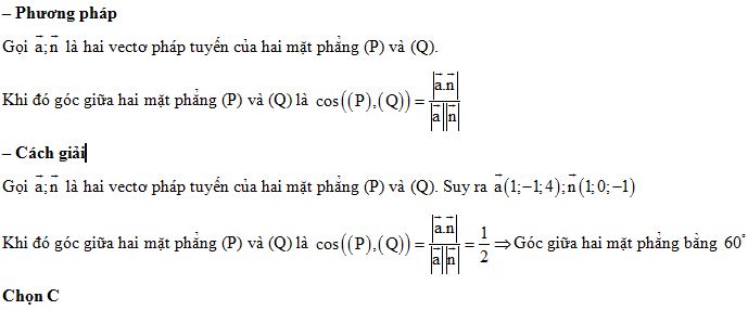 Trong không gian với hệ tọa độ Oxyz, cho hai mặt phẳng \(\left( P \right):x - y + 4z - 2 = 0\) và \(\left( Q \right):2x - 2z + 7 = 0\). Góc giữa hai mặt phẳng (P) và (Q) là: