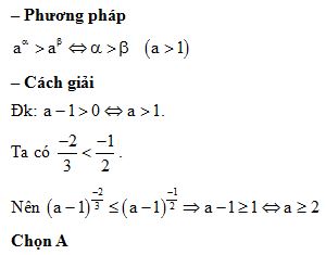 Cho \({\left( {a - 1} \right)^{{{ - 2} \over 3}}} \le {\left( {a - 1} \right)^{{{ - 1} \over 2}}}\) Khi đó ta có