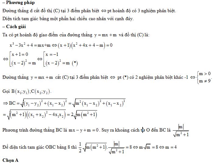 Để đồ thị (C) của hàm số \(y = {x^3} - 3{x^2} + 4\) và đường thẳng y = mx + m cắt nhau tại 3 điểm phân biệt A(-1;0), B, C sao cho có diện tích bằng 8 thì:
