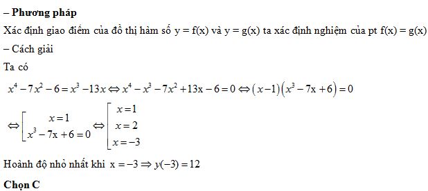 Gọi A là giao điểm của đồ thị hàm số \(y = {x^4} - 7{x^2} – 6\) và \(y = {x^3} - 13x\) có hoành độ nhỏ nhất khi tung độ của A là