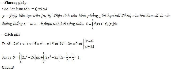 Diện tích hình phẳng giới hạn bởi đồ thị (C) của hàm số \(y = - 2{x^3} + {x^2} + x + 5\) và đồ thị (C’) của hàm số \(y = {x^2} - x + 5\) bằng: