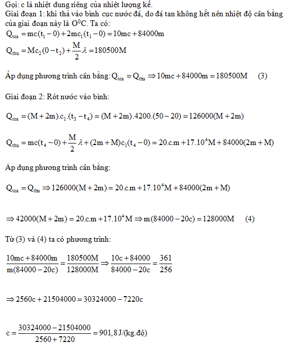 Một bình nhiệt lượng kế khối lượng \({m_1} = m\) chứa một lượng nước có khối lượng \({m_2} = 2m\) hệ thống đang có nhiệt độ \({t_1} = {10^0}C\). Người ta thả vào bình một cục nước đá khối lượng M nhiệt độ \({t_2} = - {5^0}C\) khi cân bằng cục nước đá chỉ tan một nửa khối lượng của nó. Sau đó rót thêm một lượng nước ở nhiệt độ \({t_3} = {50^0}C\) có khối lượng bằng tổng khối lượng của nước và nước đá có trong bình. Nhiệt độ cân bằng của hệ sau đó là \({t_4} = {20^0}C\). Bỏ qua sự trao đổi nhiệt với môi trường xung quanh, coi thể tích của bình đủ lớn, biết nhiệt dung riêng của nước và nước đá lần lượt là c1 = 4200J/(kg.độ); c2 = 2100J/(kg.độ), nhiệt nóng chảy của nước đá là \({34.10^4}\,\,J/kg\). Xác định nhiệt dung riêng của chất làm nhiệt lượng kế.