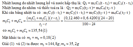 Một nhiệt lượng kế khối lượng m1 = 120g, chứa một lượng nước có khối lượng m2 = 600g ở cùng nhiệt độ t1 = 20 C. Thả vào nhiệt lượng kế một hỗn hợp nhôm và thiếc có khối lượng tổng cộng m = 180g được nung nóng tới nhiệt độ t2 = 1000 C. Khi có cân bằng nhiệt, nhiệt độ của hệ là t = 24 0 C. Tính khối lượng của nhôm và thiếc có trong hỗn hợp? Biết nhiệt dung riêng của chất làm nhiệt lượng kế, nước, nhôm và thiếc lần lượt là: c1 = 460J/kg.K, c2 = 4200J/kg.K, c3=880J/kg.K, c4 = 230J/kg.K.
