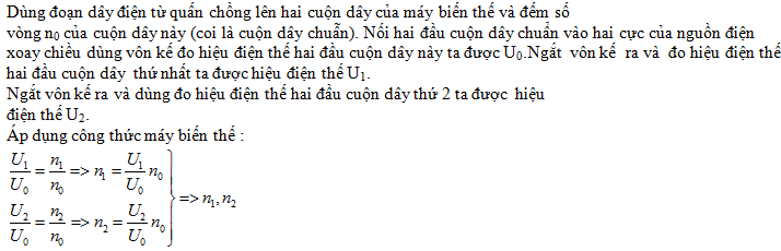 Hãy xác định số vòng dây của hai cuộn dây trong một máy biến thế bị mất nhãn với các dụng cụ sau: một dây điện từ dài, một nguồn điện xoay chiều, một vôn kế xoay chiều, các dây dẫn điện đủ để nối mạch điện. Coi vôn kế có điện trở rất lớn. Bỏ qua điện trở của các cuộn dây của máy biến thế, điện trở của dây điện từ và các dây nối