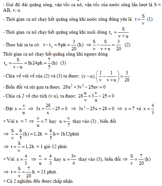 Một chiếc ca nô chuyển động trên quãng sông thẳng nhất định AB, người lái ca nô nhận thấy: Để đi hết quãng sông, những hôm nước sông chảy thì thời gian ca nô khi xuôi dòng từ A đến B ít hơn thời gian những hôm nước sông đứng yên là 9 phút, còn khi ngược dòng từ B về A hết khoảng thời gian là 1 giờ 24 phút.