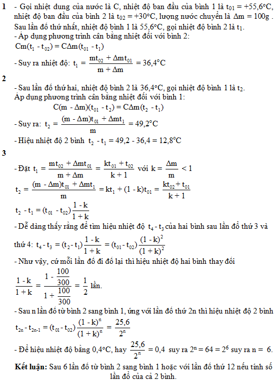 3. Cứ đổ đi đổ lại như thế với cùng 100g nước lấy ra. Tìm số lần đổ từ bình 2 sang bình 1 để hiệu nhiệt độ của nước trong hai bình khi cân bằng nhiệt là 0,4oC.