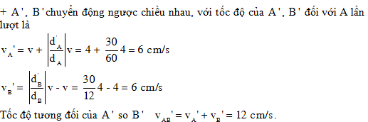 3. Đặt thấu kính trên trong khoảng giữa hai điểm sáng A và B sao cho A, B nằm trên trục chính của thấu kính, cách nhau một đoạn 72 cm và ảnh của A trùng với ảnh của B. Sau đó, cố định vị trí của A, B và tịnh tiến thấu kính theo phương vuông góc với trục chính với tốc độ không đổi v = 4 cm/s. Xác định tốc độ chuyển động tương đối của so với .