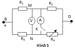 Mạch điện như hình 1. Biết R1 = R2 = 3; R3 = 2; R4 là một biến trở. Ampe kế, các dây nối và khóa K có điện trở không đáng kể. Vôn kế có điện trở vô cùng lớn.
