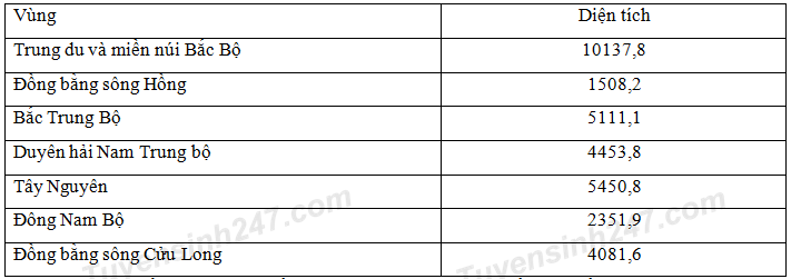 Cho biết nhận xét nào sau đây đúng về diện tích phân theo vùng nước ta đến hết 31/12/2015?