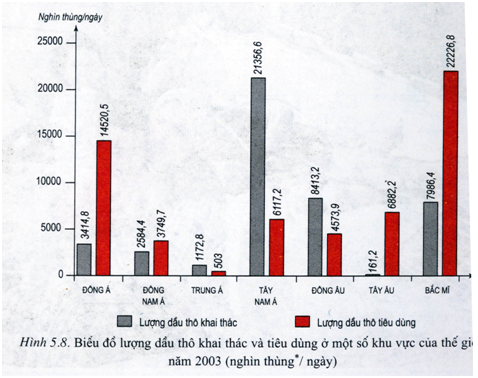 Cho biểu đồ sau Lượng dầu thô khai thác và tiêu dùng ở một số khu vực của thế giới năm