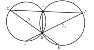 Cho hai đường tròn \(\left( {O;R} \right)\) và \(\left( {{O_1};R'} \right)\) cắt nhau tại \(A\) và \(B\). Vẽ đường thẳng qua \(A\) và vuông góc với \(AB\) cắt \(\left( O \right),\left( {{O_1}} \right)\) lần lượt tại \(C,D\). Tia \(CB\) cắt \(\left( {{O_1}} \right)\) tại \(E\), tia \(DB\) cắt \(\left( O \right)\) tại \(F\). Khẳng định nào đúng?