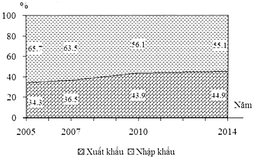 Cho biểu đồ Cơ cấu giá trị xuất, nhập khẩu của Hoa Kì, giai đoạn 2005-2014 Nhận xét nào sau