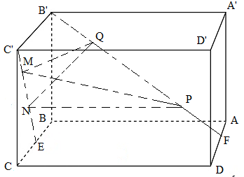 Cho hình hộp chữ nhật \(ABCD.A'B'C'D'\) có \(AB = 6cm,BC = BB' = 2cm\). Điểm \(E\) là trung điểm cạnh \(BC\). Một tứ diện đều \(MNPQ\) có hai đỉnh \(M\) và \(N\) nằm trên đường thẳng \(C'E\), hai đỉnh \(P,Q\) nằm trên đường thẳng đi qua điểm \(B'\) và cắt đường thẳng \(AD\) tại điểm \(F\) . Khoảng cách \(DF\) bằng