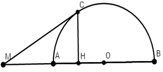 Cho nửa đường tròn \(\left( O \right)\), đường kính \(AB\). Trên tia đối của tia \(AB\) lấy một điểm \(M\). Vẽ tiếp tuyến \(MC\) với nửa đường tròn. Gọi \(H\) là hình chiếu của \(C\) trên \(AB\). Chọn đáp án đúng.