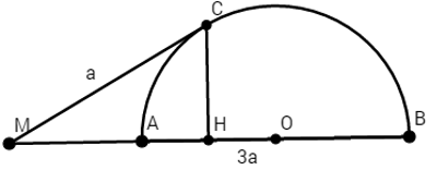 Cho nửa đường tròn \(\left( O \right)\) đường kính \(AB\). Trên tia đối của tia \(AB\) lấy một điểm \(M\). Vẽ tiếp tuyến \(MC\) với nửa đường tròn. Gọi \(H\) là hình chiếu của \(C\) lên \(AB\). Biết \(MC=a,MB=3a\). Độ dài đường kính \(AB\) là?