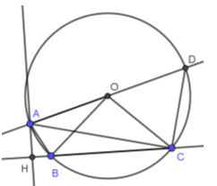 Cho tam giác \(ABC\) nội tiếp đường tròn \(\left( {O;R} \right)\) có \(AB = 5cm,AC = 12cm\) và đường cao \(AH = 3cm\) (\(H\) nằm ngoài \(BC\)) , khi đó \(R\) bằng