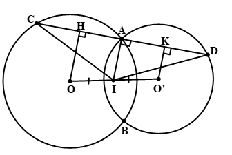 Mấu chốt của bài hình này là các em vẽ thêm được \(OH \bot CD{;^{}}O'K \bot CD\), để từ đó, bằng các kiến thức cơ bản về đường trung bình của hình thang, mối quan hệ giữa đường kính và dây cung các em chứng minh được: \(AC = AD\).