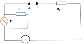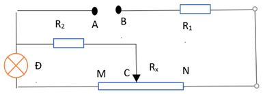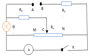 Nguồn điện có hiệu điện thế không đổi UAB = 42V, MN là một vật dẫn đồng chất , tiết diện đầu có điện trở tổng cộng R = 9Ω, R1 = 6Ω, bóng đèn có điện trở xác định RĐ = 9Ω. Ampe kế, khóa K và dây nối có điện trở không đáng kể.