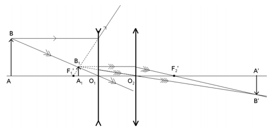 Cho một hệ gồm hai thấu kính L1và L2 được đặt sao cho trục chính trùng nhau. Quang tâm của hai thấu kính cách nhau một đoạn 12cm. Thấu kính L1 là thấu kính phân kì có tiêu cự 10cm, thấu kính L2 là thấu kính hội tụ có tiêu cự 15cm. Đặt vật sáng AB vuông góc với trục chính của thấu kính (A nằm trên trục chính), trước L1 một đoạn 40cm. Tìm vị trí đặt màn M để ảnh qua hệ hiện rõ nét trên màn và vẽ ảnh của AB qua hệ.
