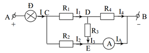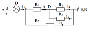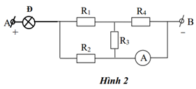 Cho mạch điện như hình vẽ (hình 2). Hiệu điện thế hai đầu mạch điện là U = 12V, các điện trở R1 = 4Ω; R4 = 12Ω. Điện trở của ampe kế nhỏ không đáng kể. Trên đèn Đ có ghi 6V – 9W.