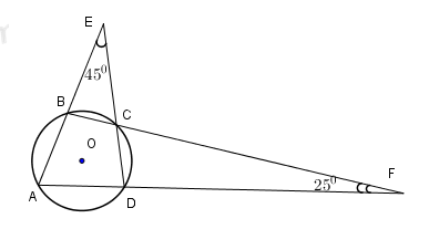 Sử dụng tính chất góc ngoài tam giác cho các tam giác BCE, DCF tổng hai góc đối trong tứ giác nội tiếp ABCD để tính\(\widehat {BCE} \Rightarrow \widehat {ABC}\)