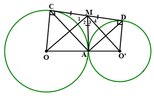 “Cho hai đường tròn (O) và (O’) tiếp xúc ngoài tại A. Gọi CD là tếp tuyến chung ngoài của hai đường tròn \((C \in (O);D \in (O'))\).