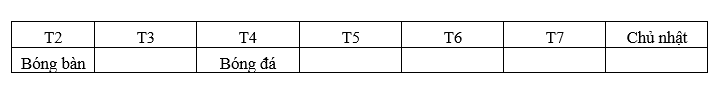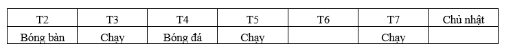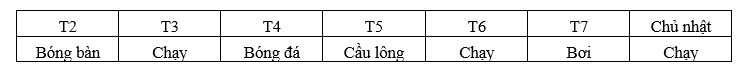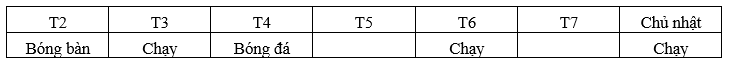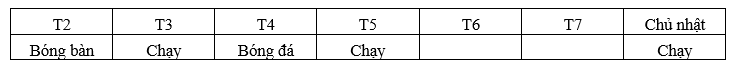 Trong tuần, mỗi ngày thầy Tưởng chỉ chơi một môn thể thao. Thầy Tưởng chạy ba ngày một