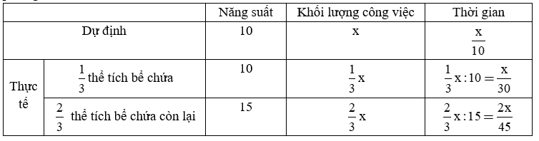 Một máy bơm muốn bơm đầy nước vào một bể chứa trong thời gian đã định thì mỗi giờ phải bơm được 10 m3. Sau khi bơm được \(\frac{1}{3}\) thể tích bể chứa, người công nhân vận hành cho máy hoạt động với công suất lớn hơn 5m3 mỗi giờ so với ban đầu. Do vậy, so với quy định bể chứa được bơm đầy trước 48 phút. Tính thể tích bể chứa.