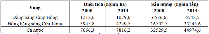 Cho bảng số liệu: DIỆN TÍCH VÀ SẢN LƯỢNG LÚA CỦA CẢ NƯỚC, ĐỒNG BẰNG SÔNG HỒNG VÀ