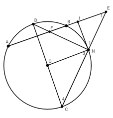 Cho đường tròn (O) và một dây AB. Vẽ đường kính CD vuông góc với AB (D thuộc cung nhỏ AB). Trên cung nhỏ BC lấy một điểm N. Các đường thẳng CN và DN lần lượt cắt các đường thẳng AB tại E và F. Tiếp tuyến của đường tròn (O) tại N cắt các đường thẳng AB tại I. Chọn đáp án đúng
