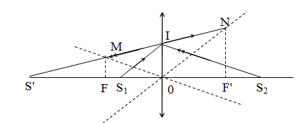 Hai điểm sáng S1, S2 đặt hai bên thấu kính và cách nhau 16cm trên trục chính của thấu kính có tiêu cự f = 6cm. Ảnh tạo bởi thấu kính của S1 và S2 trùng nhau tại điểm S’.