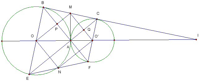 b) Gọi giao điểm của OM với AB là P; giao điểm của O’M với AC là Q. Chứng minh APMQ là hình chữ nhật.