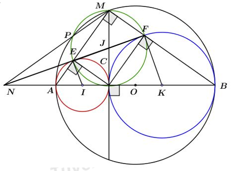 Cho đường tròn tâm O, đường kính AB và một điểm C di động trên đoạn AB. Vẽ các đường tròn tâm I đường kính AC và đường tròn tâm K đường kính BC. Tia Cx vuông góc với AB tại C, cắt (O) tại M. Đoạn thẳng MA cắt đường tròn (I) tại E và đoạn thẳng MB cắt đường tròn (K) tại F.