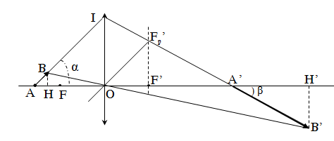 2. Điểm sáng A đặt trên trục chính của thấu kính hội tụ cách thấu kính một khoảng OA = 60cm. Tiêu cự của thấu kính f = 40cm. Cho điểm sáng A chuyển động trong thời gian 16 giây với vận tốc 0,5cm/s theo phương hợp với trục chính một góc α = 600 lại gần về phía thấu kính. Xác định vận tốc trung bình của ảnh và góc β hợp bởi phương chuyển động của ảnh với trục chính.