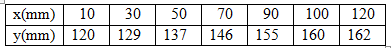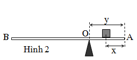 Đặt vật khối lượng m lên trên thanh ở cách đầu A của thanh một đoạn là x, thanh nằm cân bằng trên một điểm tựa tại O trên giá đỡ cách đầu A một đoạn là y (như hình 2). Khi vật m đặt ở các vị trí khác nhau, để đảm bảo cho thanh cân bằng theo phương nằm ngang, học sinh đó thu được bảng số liệu như sau:
