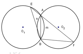 Cho hai đường tròn \(\left( {{O_1}} \right)\) và \(\left( {{O_2}} \right)\)có bán kính bằng \(R\) cắt nhau tại hai điểm \(A,\,B.\) Qua \(A\) vẽ cát tuyến cắt hai đường tròn \(\left( {{O_1}} \right)\) và \(\left( {{O_2}} \right)\) thứ tự tại \(E\) và \(F.\) Khi đó
