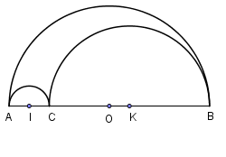 Cho điểm \(C\) thuộc đoạn thẳng \(AB\) sao cho \(AC = 10\,cm,\,BC = 40\,cm.\) Vẽ về một phía của \(AB,\) nửa đường tròn có đường kính theo thứ tự \(AB,\,AC,\,CB\) và có tâm theo thứ tự là \(O,\,I,\,K.\) Diện tích hình giới hạn bởi ba nửa đường tròn là: