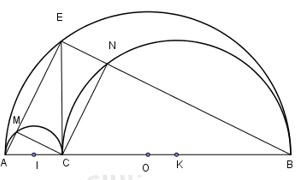 Xem giả thiết ở câu 13. Giả sử thêm rằng đường vuông góc với \(AB\) tại \(C\) cắt nửa đường tròn \(\left( O \right)\) tại \(E.\) Gọi \(M,\,N\) theo thứ tự là giao điểm của \(EA,\,EB\) với các nửa đường tròn \(\left( I \right),\,\left( K \right).\) Khi đó \(MCNE\) là hình: