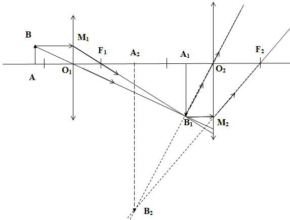 b. Nếu người quan sát thấy ảnh cách mắt 25cm, thì ảnh qua thị kính lớn hơn vật bao nhiêu lần ?(chỉ dùng kiến thức hình học không dùng công thức thấu kính).